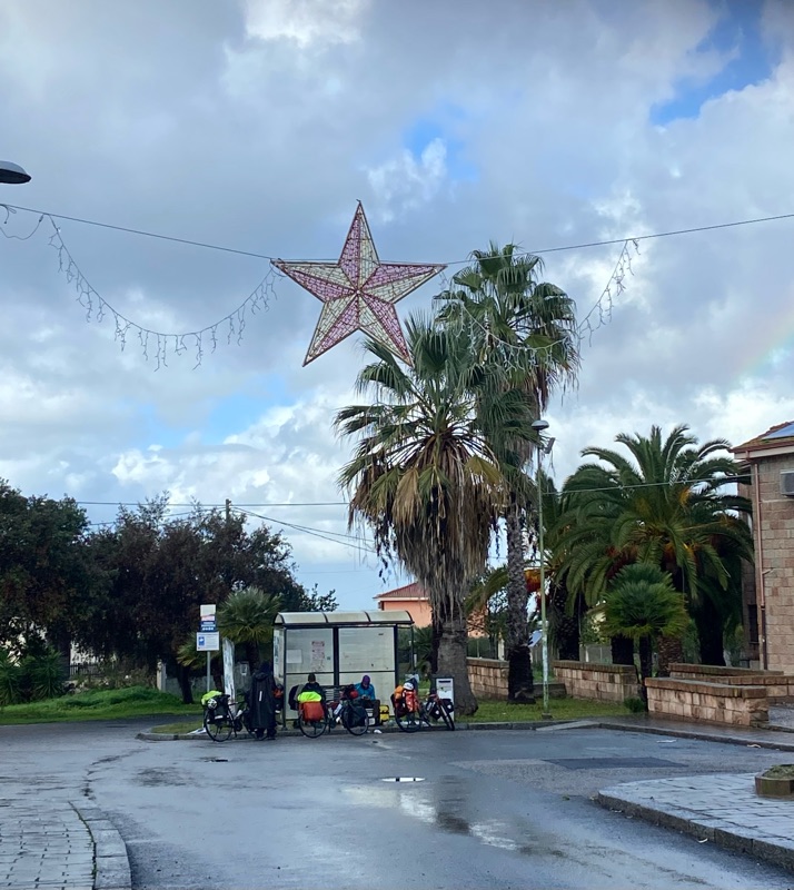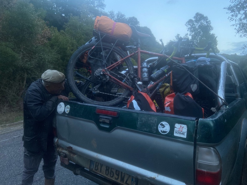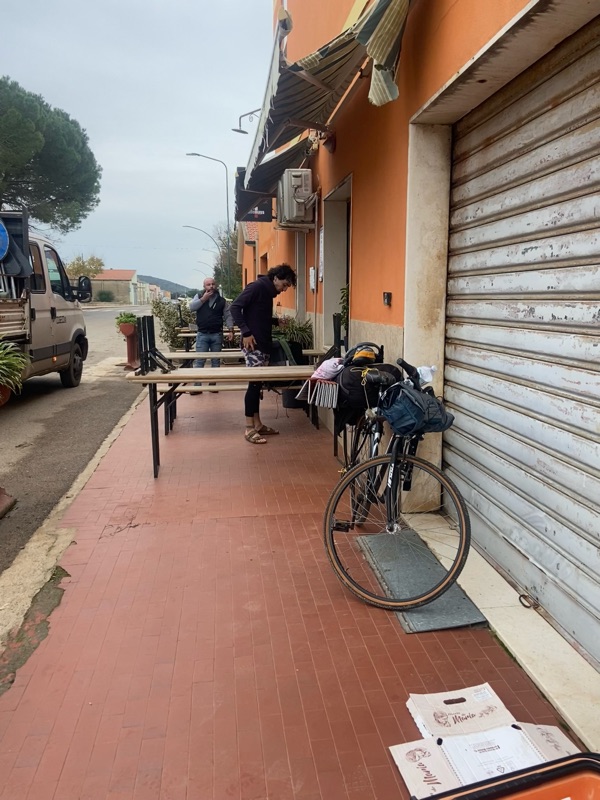 After that I rode to some eligible camp spots, determined to find a good one and make my team proud and thats when I rode into Davide. A strikingly beautiful Italian boy. He had just bought a bike on marketplace for 50 euros, strapped all his heavy bags to it and was biking to Olbia, on the opposite north east side of the island so he could get back to Abruzzo for Christmas. When I found him he was talking to a man in a grey van, and Davide left to go get something he had forgetton and the man asked me if I wanted some free milk, I said sure and he said told I was “super warm” and I said “no, no pretty cold!” He repeated himself, “super…warm…” I shivered and demonstrated I was cold and finally realized he was telling me “superwoman.” Davide came back and the man clapped him on the shoulder, my bambini! Said his father. We all smiled at eachother in the setting sun and Davide said he was just starting to bike now and asked if I wanted to join. I asked where he was planning on going and he said 3 hours away, despite night falling, and he didn’t have food, other than lentils, or water.