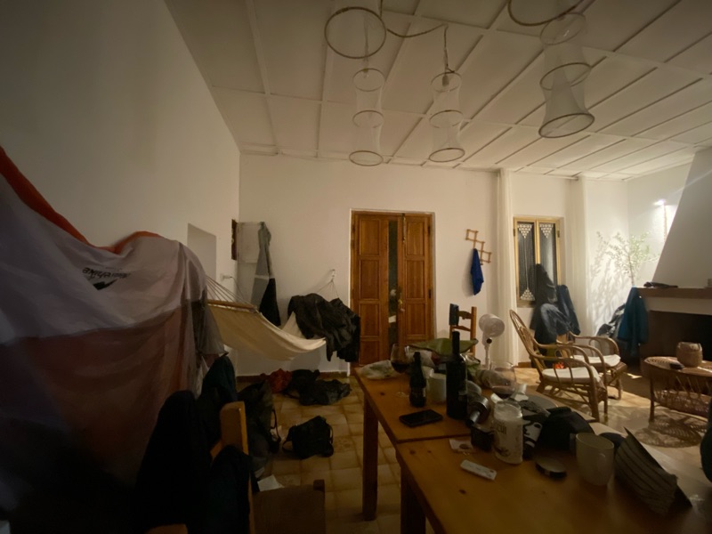 Completely unexpected and random, for us and for them, they kept being confused as to why we didn’t want to highline, why wouldn’t you want to dangle in a grotto in front of some of the world’s best?! (its basically impossible to stand your first times and takes a lot of practice).They kept telling us biking is more dangerous (probably true) and that they were impressed by our strength. Watching them was like going to the circus, every person in their happy place and personal styles on the line with a giant boombox that flowed music into the valley of a stunning backdrop of cliffed rolling hills. “Van life” stoners, kind hippies, digital nomads, half of them from Italy, all of them stoked on highlining, it felt like they were pedalling a religion each day pressing us, “tomorrow you will try. Just sign the waiver!” I feel bad almost to admit that I wasn’t enjoying being there. The first night we arrive we slept in the mechanical shop on the concrete floor, out of the rain, but the mud-poo was on over my clothes and now my tent, the cats kept eating my small supply of food, and Mickey the old man told everyone I was his Canadian girlfriend and kept grabbing my waist and kissing me 3x on the cheek every morning, to which often I’d go the wrong direction and be full on kissing the guy all before 7 am. I found later i was the only person he was letting use his bathroom and shower, I had no idea tbere were separate ones outdoors we were meant to use…Donkeys, pigs and chickens and dogs called out all night long. Everyone was kind but also hard to connect to fully, I got tired after the first two hours of being there of talking about highlining. Which was too bad for me because almost all conversational routes led there. There was an indoor area with a fire and old blankets hung up to makeshift a warm box but it too was dirty and mud-poo covered, the place just felt really gross and my comfort levels again were tested.
