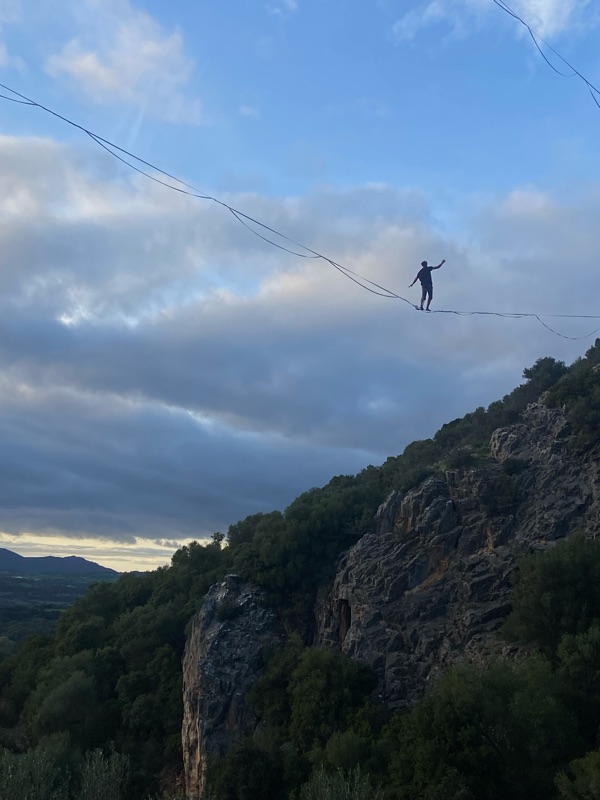 The next day the rain stopped and we decided to ride into the wind, so far Sardenia had been flat point and we took to the mountains, into brilliant cliffs and luscious rolling hills of wild horses and donkeys. Night was falling, the sun dying, the humidity climbing with us, and the rian decided to join in and my hands were almost as pink as the flamingos and my body shook. So when a 70 year old man in a pickup stopped and told us we could sleep at his house, we were in, down for an experience of staying with a local. We threw two of our bikes in the cab and the other two held onto the back as Mickey drove us to the his farm in middle of nowhere. As he drove us I noticed stickers along his dash depicting rock climbing and highlining. I met a girl in Sicily who told me that if I went to Sardinia I had to find this famous community of highliners and I had asked a kloe on the ferry over if she knew about it and she had to google what highlining even was. We arrived in the dark to his home, where his headlights illuminated the mix of mud and farm poo his little home and a barn full of 20 highliners from around the world who call his place “bounce land” and work all summer in order to spend their winters there. We had found the highlining oasis after all.