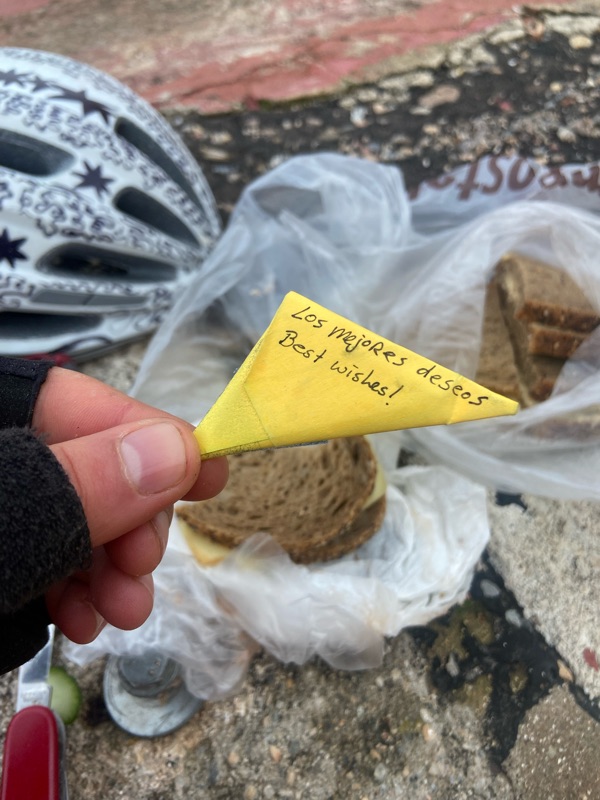 Over the few days I spent with Cindy and Yvonne, over meals shared on their balcony in the sun and sitting side by side on the couch, I got to know these two very grateful and positive people. Being in their home and around their grounding energy really helped restore my spirit. They make their income from being professional house sitters and I really admired how they made up their life as they went along, designing and creating it how they like, despite often their friends and family’s scoffing. It felt like the two of them with their love could take on the world. The year before they had helped clean up the floods in Valencia, they said it was a mess that nobody knew how to clean but everybody just simply grabbed a mop and began. They also did this thing on their bike ride down from Holland to Spain this year where they gave people little Regalos of money, wrapped up notes in tissue that they would hand to them and walk away. People who they saw just deserved a little gift, like a friendly woman working really hard and who radiated joy at a grocery store. I thought it was really beautiful that they just really saw people. The next day when I left, after they had already given me so much, I grabbed for my Nutella sandwich and in between the slices found a Regalo of money. They had seen me as well. I thought all day as I rode about how to keep passing along the gratitude, the random acts of kindness, how easy it is to feel like you need to hold on to you assets and how easy it is to share.