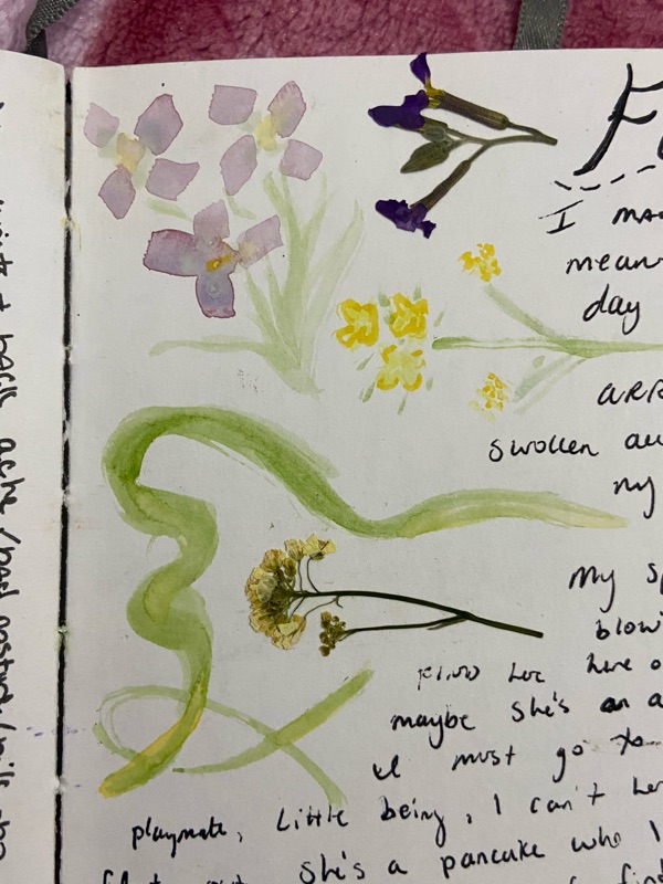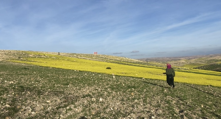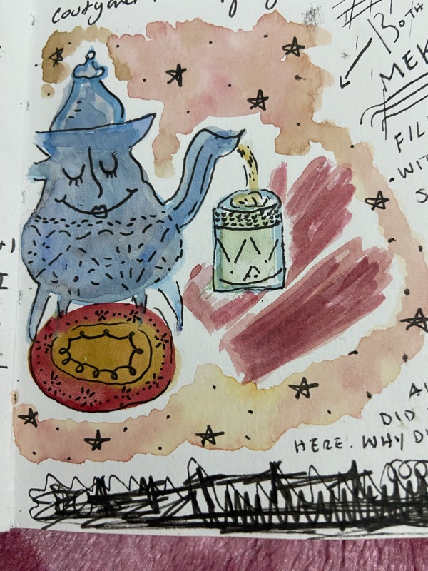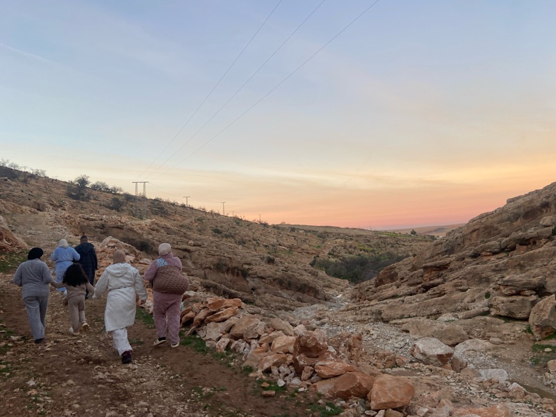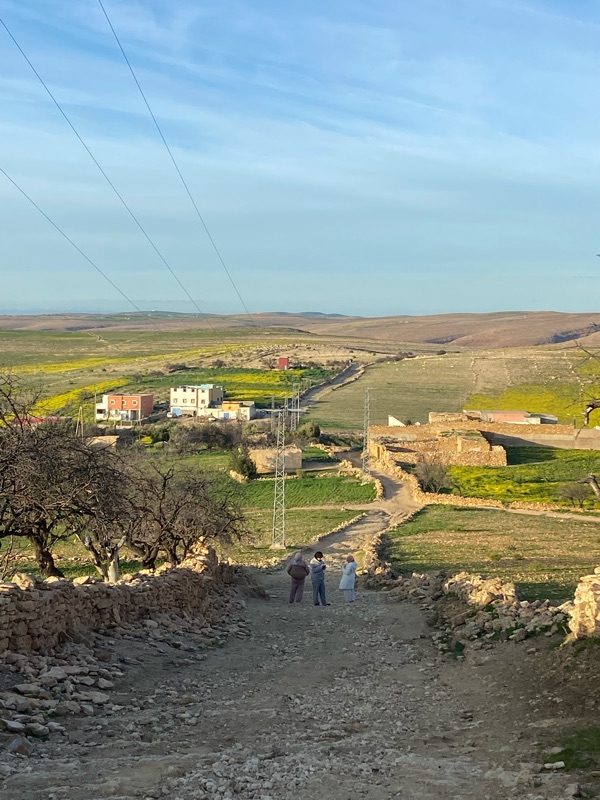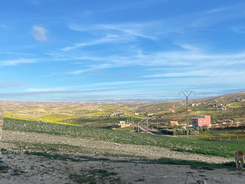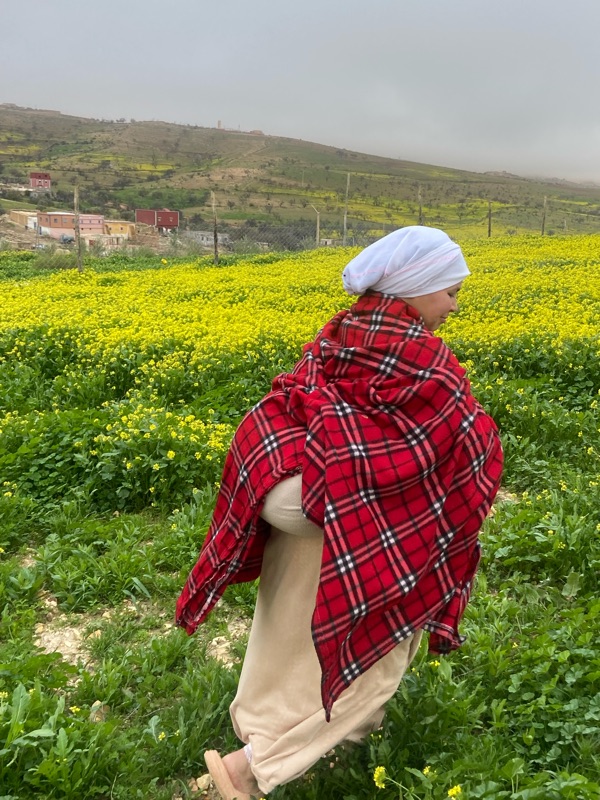 Their house is cement and big on the top of a rolling hill amongst fields of neon yellow flowers and the road passing by is a long steep incline I will eventually leave on taunts and beckons my entire stay. Mariam is my main host, she has a newborn that she slings onto her body or hands off to a coo-ing family member. Her and her sister are so sweet and make me feel at home. We speak a mix of English, French, and google translate. I take a shower and after they cover me in rose oil and spray me with perfume. Little do I know the peace is fleeting, as they have a yearly event of their entire family and village coming to honour their ancestors in the house. Soon there is men saying the Quaran in one room together in unison. Women cooking Tagines, fried potatoes, and couscous in humungous pots in the basement. I again am invited to eat in multiple rooms with multiple different groups of people. We sit together and try to communicate and often they laugh at me while I laugh at the ridiculousness of my present moment. I’m so full I have to decline invites. My best friend is a 7 year old named Wassil who tells me her favorite things are speaking English and colouring. We spent the day outside and I teach her how to make use watercolour paints and we run through the fields together.