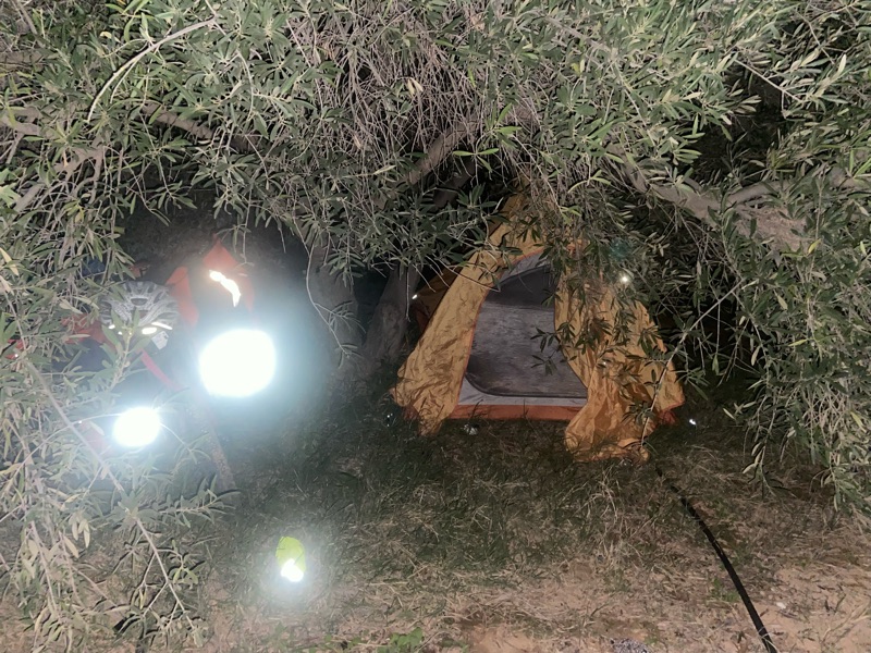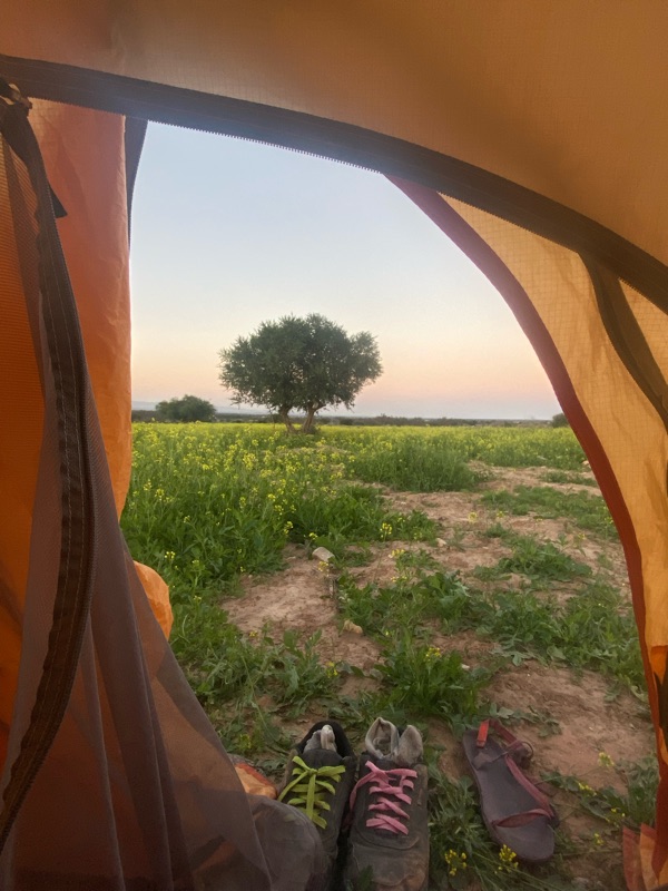 -woke up underneath an olive tree in my tent where I slept well and felt safe. I met the owner of the ”Honey Badger Cafe” the day before and told me it was safe to sleep here. His dream was to open the cafe in his village, he made a mean sandwich and still texts me weekly checking in and wishing me well.